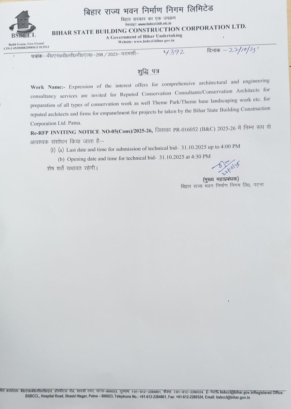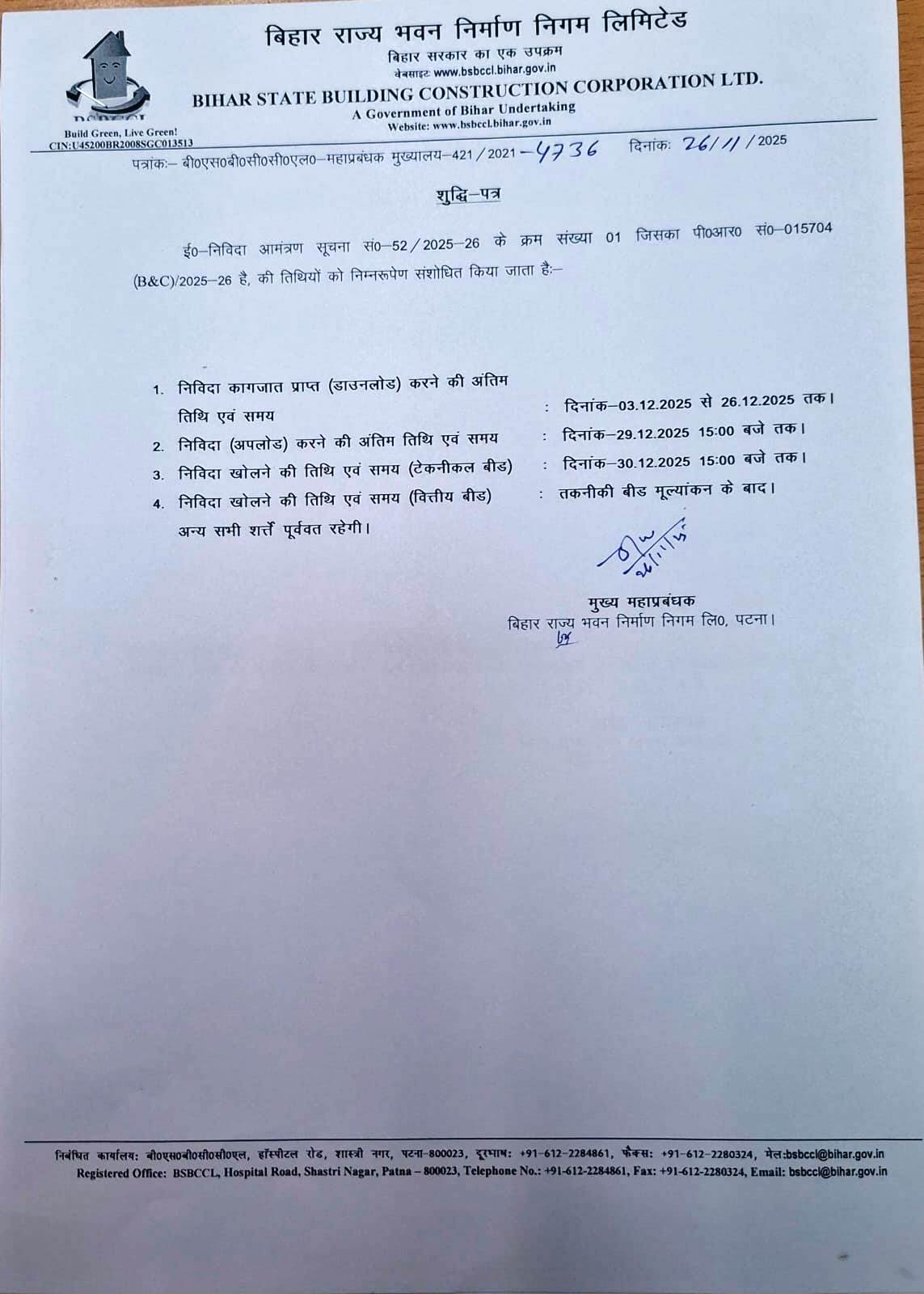 NIT-26/2024-25 (Additional Work (Signages,AC,RO,CCTV,Genset&AMC) at Sports Building cum Gymnasium in the South Bihar 13 District-Rohtas,Bhojpur,Patna,Gaya,Arwal,Aurangabad,Jehanabad,Nawada,Lakhisarai,Jamui,Khagariya,Bhagalpur & Banka and Construction work of 50 Bedded Minority Girl s Hostel in the campus of B P Inter School at Begusarai District) |
